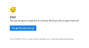 Webページが以下表示になっている場合はツールが居眠りしているので、ボタン【Yes, get this app back up!】を押して起こしてください。